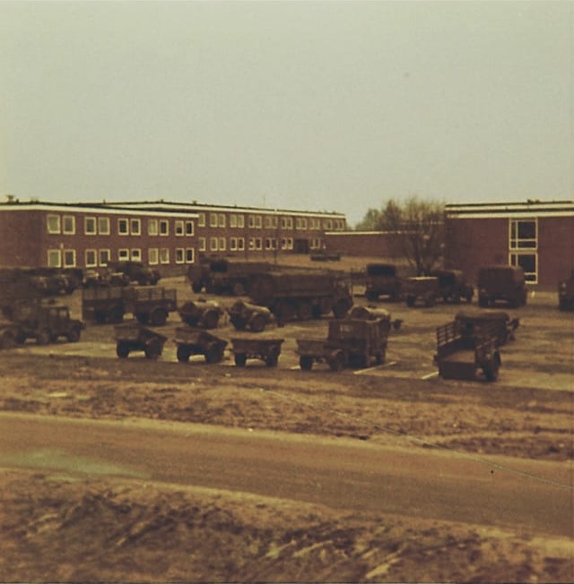P-plaats-SSVCie.jpg : De parkeerplaats van de SSV compagnie met links op de foto het compagnies-gebouw. Kennelijk zijn er flink wat voertuigen op pad, want er zijn veel open plaatsen.