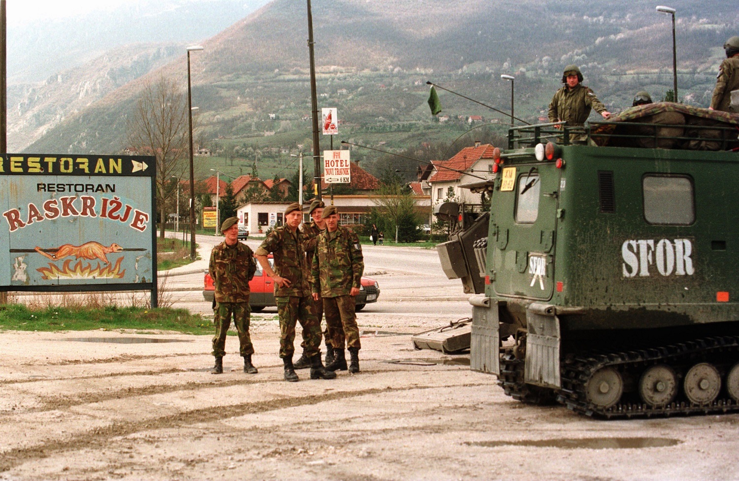 Nederlandse militairen van 42 Pantserinfanteriebataljon LJ tijdens SFOR bij een Bandvag 206 rupsvoertuig. Daarachter is nog net de achterkant en klep van een YPR 765 pantserrupsvoertuig te zien.