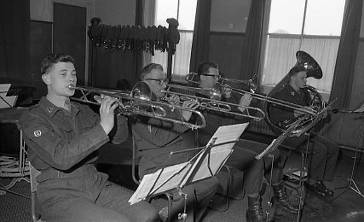 Repetitie van 't muziekkorps De Limburgse Jagers Frederik Hendrik kazerne Venlo-Blerick